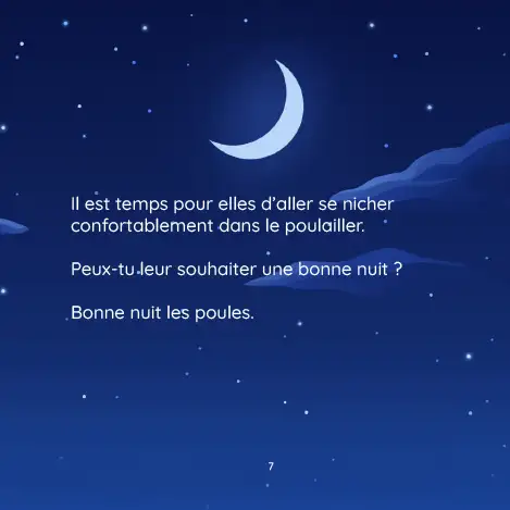 Les enfants participent en répétant les cris des animaux — « cot-cot », « meuh », « hiiii » — et en souhaitant bonne nuit à chaque ami de la ferme.