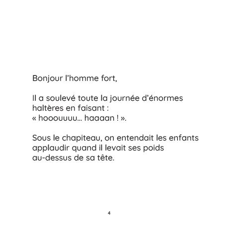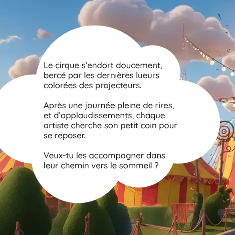 Du clown un peu étourdi à l’acrobate courageuse, en passant par le dompteur rassurant, les artistes, les musiciens et même les animaux fatigués, chacun raconte sa journée pleine d’émotions avant de glisser sous sa couverture.